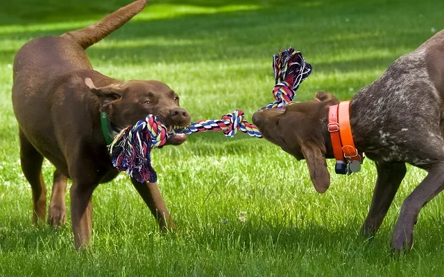 Ambii câini ai mei iubesc frânghia. Fiecare apucă un capăt și se joacă împreună. Îi ține distrați și nu mai rod mobila.