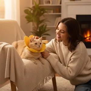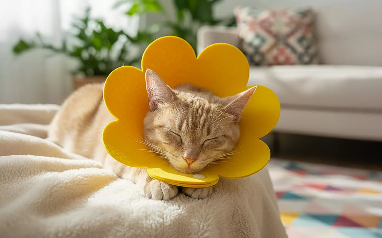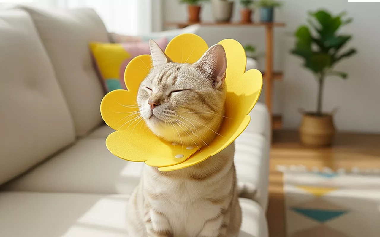 Mi-a plăcut cât de calm a rămas pisoiul meu cu floarea pe gât. Este mult mai confortabil decât cele de plastic de la veterinar.