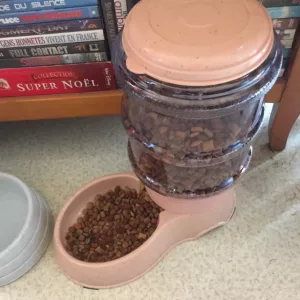 Sunt foarte mulțumit de acest distribuitor de hrană. Este din plastic solid și vine cu mici mânere pentru a nu aluneca și pentru a nu se scurge. Vasul are dimensiunea perfectă!
