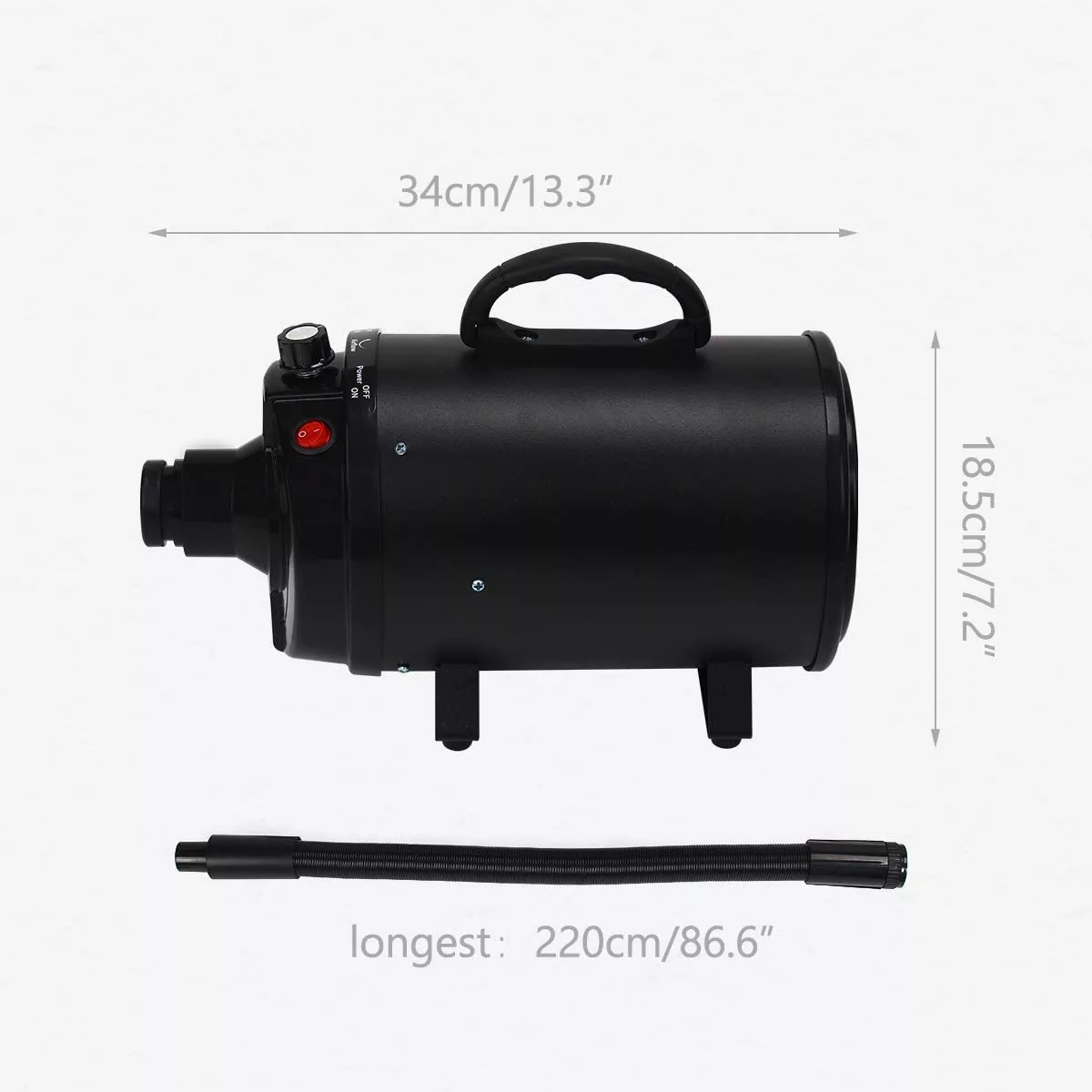 NOTĂ: Uscătorul nostru pentru animale este durabil și rezistent pentru utilizare pe termen lung, dar asigură-te că animalele nu mușcă furtunul și cablul de alimentare.