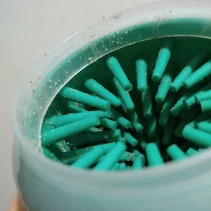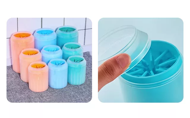 Produsul nostru are peri groși în interiorul unui recipient ușor de ținut. Funcționează ca o mini mașină de spălat pentru lăbuțele câinelui tău.