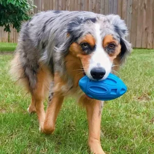 Această minge rezistă la rosul agresiv al husky-ului meu. Face mult mai multă mișcare acum și mă bucur să știu că e sigură pentru dinții ei!