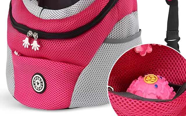 Câinele meu încape perfect datorită șnurului reglabil. Îmi place că bretelele sunt moi și nu mă dor umerii la plimbări lungi.