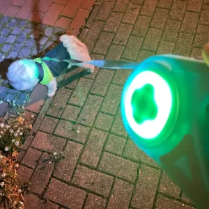 Această lesă este grozavă! Lumina este destul de puternică, iar LED-urile de la bază sunt, de asemenea, luminoase. O lesă frumoasă pentru plimbările de seară sau dimineață devreme!